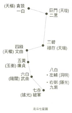 一白二黑三碧四绿五黄六白七赤八白九紫,其五行属性是一白为水、二黑五黄八白为土、三碧四绿为木、六白七赤为金、九紫为火玄空飞星是根据北斗七星而来的,《史记·天官书》记载为:斗为地车、运于中央、临制四方,分阴阳、建四时、均五行、移节度,定诸纪,皆系于斗。意思是说北斗位于天星的中央,控制四季、五行及律法的运转等等。玄空飞星的理论是根据北斗七星的旋转而加以运用。
